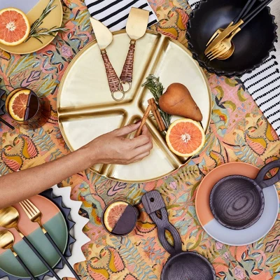 Elevate your flatware with the 5-Piece Stainless-Steel Silverware Set from Opalhouse™ designed with Jungalow™. Made from stainless steel in a gleaming golden finish, this flatware set is great for entertaining as well as everyday use. Featuring sleek handles in solid black for a polished contrast, the five-piece tableware set includes a dinner spoon, salad fork, dinner knife, dinner fork and teaspoon. Each piece is dishwasher safe for lasting shine through many uses.